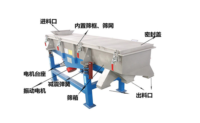 多層粉料直線振動篩為雙振動電機驅動,利用振動電機激振的原理工作。當兩臺電機作同步、反向旋轉時,其偏心塊所產生的振動力在平行于電機軸線的方向相互抵消,在振動力和物料自重力的聯合作用下,使物料在篩面上被拋起跳躍式向前作直線運動,以合理匹配篩網達到篩分的目的。